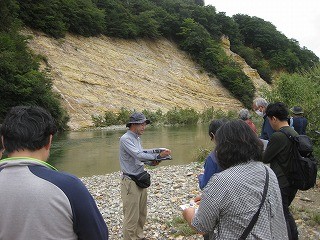 褶曲・断層面が見られる露頭から、白沢層の痕跡を観察し、河原の岩石からシルト岩などの特徴を把握した。
