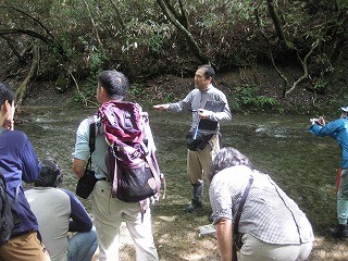 白沢層より更に古い、大手門層と日陰層が確認できる豆沢川へ移動し、断層の様子や表出した岩石を観察しながら上流部まで歩いた。日陰層は、白沢カルデラ形成前の中新世中期から後期に水没した海底で堆積した泥岩で形成され、その上に堆積した大手門層は、中新世後期に隆起して形成された白沢カルデラ内の火山活動に伴う、火砕流堆積物による凝灰岩で形成されている。