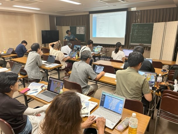 当日になって数人の欠席は出たものの、30人近い参加者を集め、大変盛況な会となりました。講師の宇根寛先生、斎藤眞先生どちらも、大変熱のこもった講義やお話をご用意いただき、地理院地図を実際に使いこなす練習や、シームレス地質図・地質図Naviを使ってさまざまな地質情報を読み解く練習をいたしました。レンタルWiFi3台を用意して正解でした。