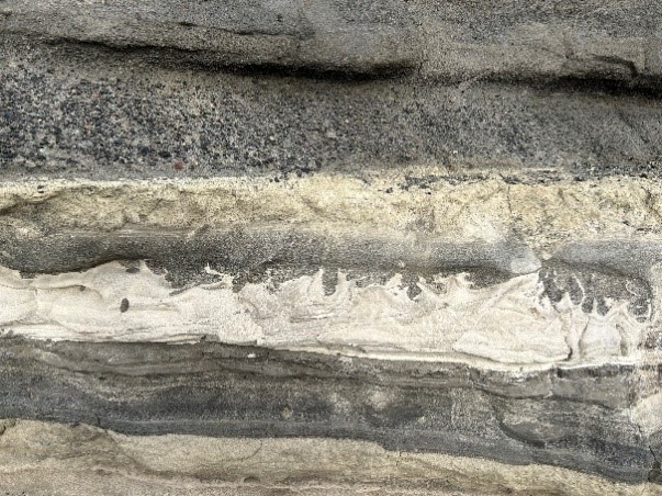長津呂湾奥の周辺で軽食休憩を取り、馬の背洞門を目指します。地層の傾斜はさらに緩やかになり、南岸では逆向きに傾く、つまり向斜軸が確認できます。地質構造には斜交層理が目立つようになり、堆積場が極めて浅くなってきたことがわかります。